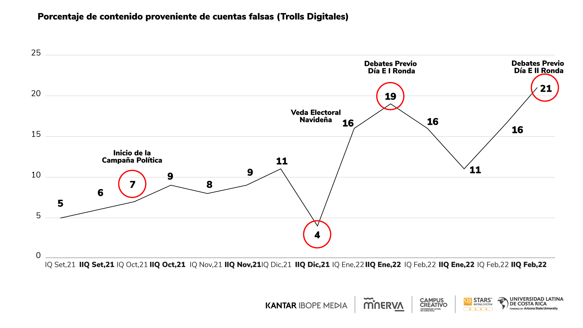 Como se nota en el siguiente gráfico, la campaña inició con un porcentaje del 7% del contenido que se publicó en redes sociales, proveniente de cuentas falsas; lo cual fue subiendo, conforme fue avanzando la campaña. En términos generales se detectó que promedio hubo 11.28% del contenido en redes provino de cuentas falsas, pero llegó a picos altos del 19% y el 21% en la semanas previas a la cita con las urnas.