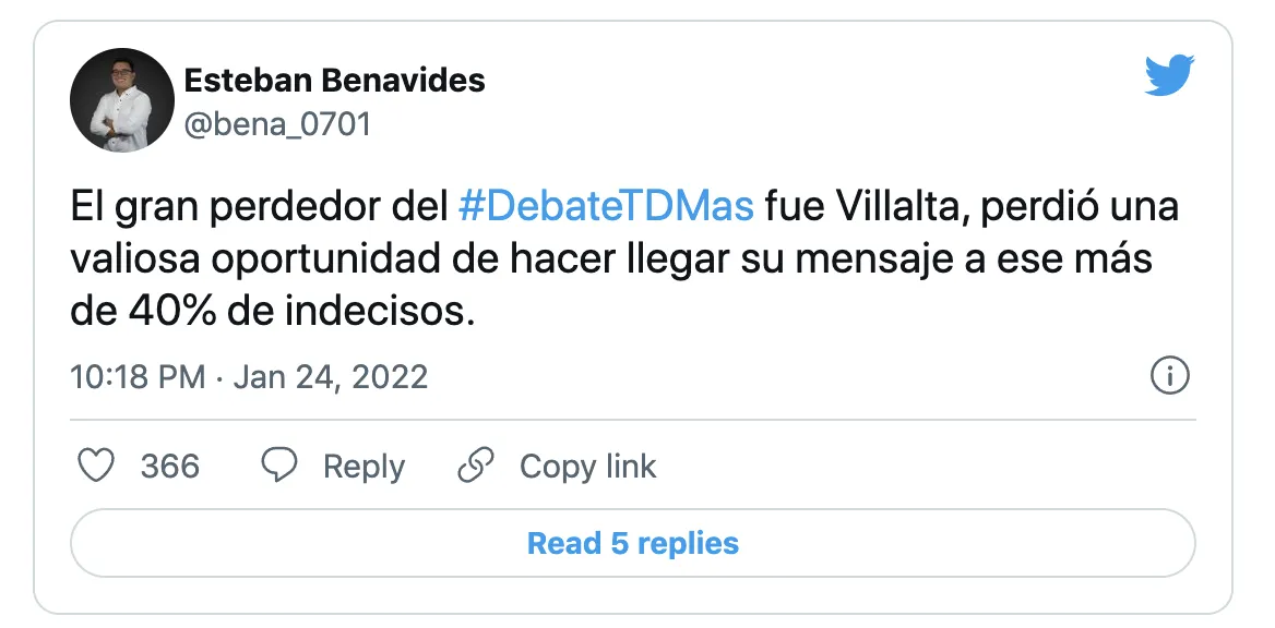 El momento cúspide de las menciones, entre los días 22 al 30 enero de 2022 lo alcanzó el debate organizado por TD Más, entre los candidatos Eli Feinzaig, del Partido Liberal Progresista (PLP) y José María Figueres, del Partido Liberación Nacional (PLN). El formato fue sumamente aplaudido porque ambos candidatos, respetando las reglas de la organización, expusieron sus ideas, reafirmaron sus mensajes clave y resaltaron sus enfoques en caso de asumir la presidencia de la República.