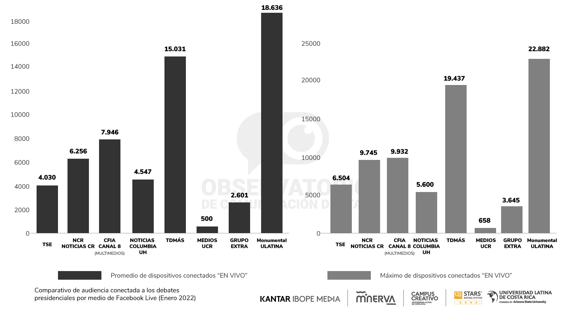 Este debate, es el que ha contado hasta el momento, con mayor audiencia y atención por parte de los cibernautas costarricenses. Al compararlo con la cantidad de dispositivos conectados en los otros debates, el de Radio Monumental-ULATINA, es el que ha sido más visto, haciendo la salvedad que los sistemas de medición, no pueden registrar la cantidad de personas por dispositivo que se encuentran conectadas; solo la cantidad de aparatos electrónicos que están siguiendo la transmisión. De igual forma, hay que dimensionar la influencia del debate Radio Monumental-ULATINA, como uno de los hechos más relevantes desde setiembre de 2021 que se está midiendo la interacción en redes sociales, alrededor del tema electoral en el país.