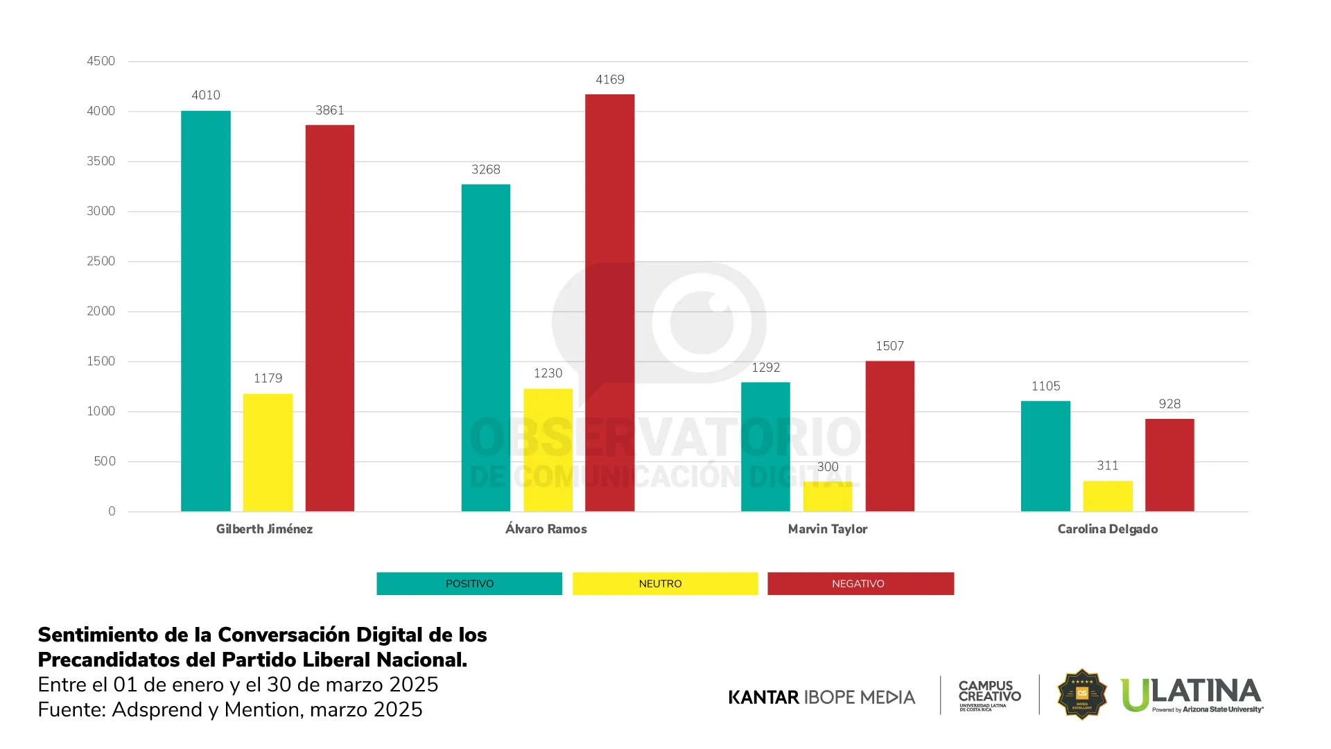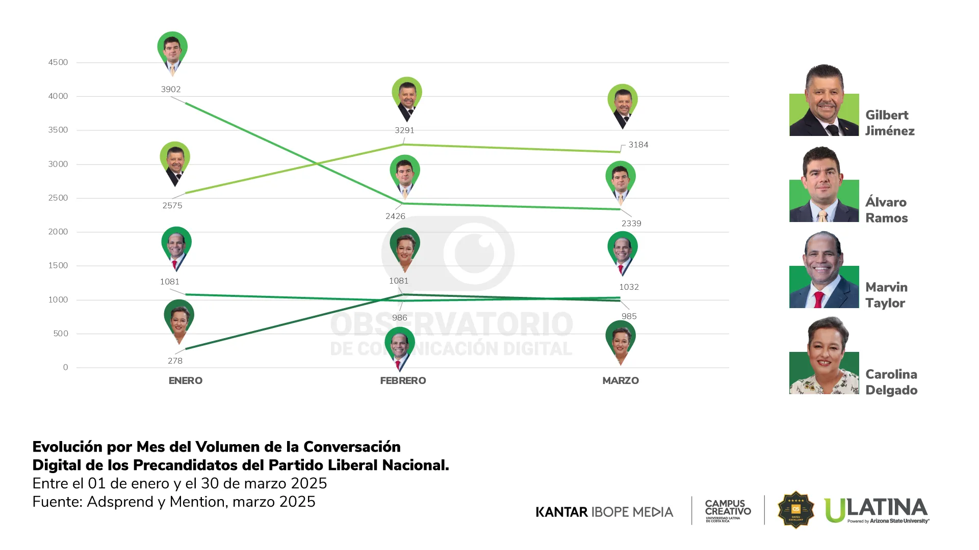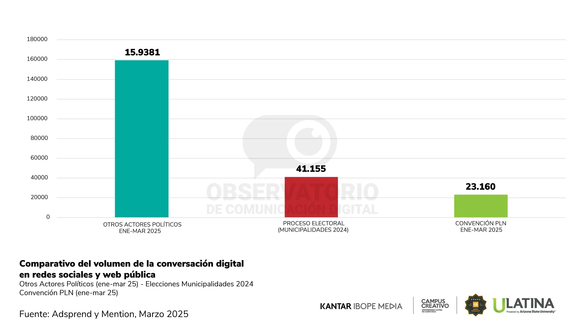 Al analizar el volumen de la conversación digital que generó la convención del Partido Liberación Nacional se nota un proceso electoral sin eco digital. Esto, a la luz de comparar las 23.160 menciones que generaron las 4 precandidaturas entre los meses de enero a marzo 2025, versus las 159.381 menciones que generó durante el mismo periodo otros actores políticos, como el presidente, ministros, diputados, entre otros. (Un 85,5% menos de interés por la convención liberacionista)