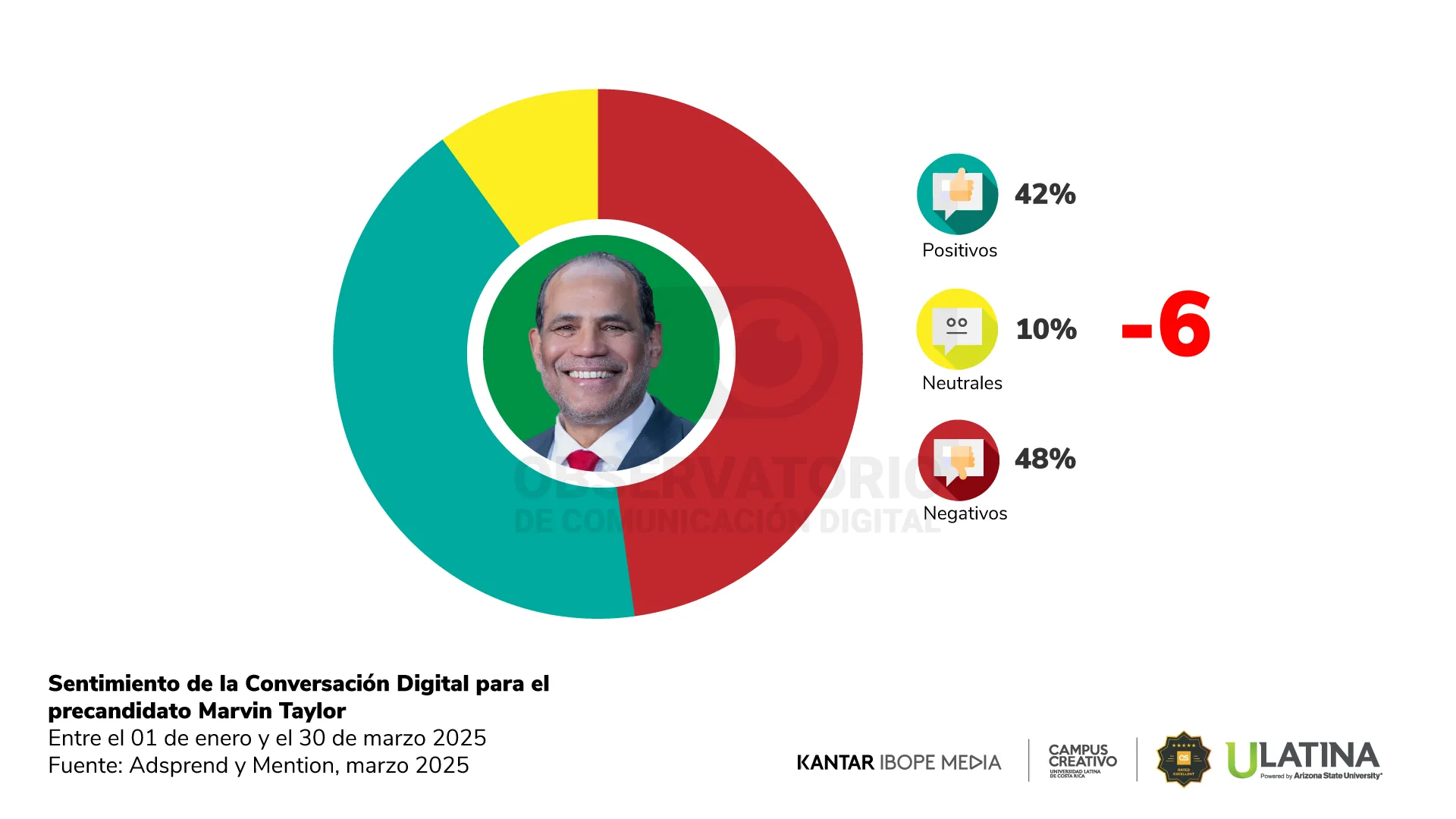 Marvin Taylor: Experiencia Internacional, sin conexión emocional (Índice de sentimiento neto: -6) El precandidato Marvin Taylor no logró consolidar una narrativa que conectara emocionalmente con los usuarios digitales. Su participación fue valorada como “técnica pero fría”, lo cual lo posicionó como una figura distante y con baja resonancia emocional.