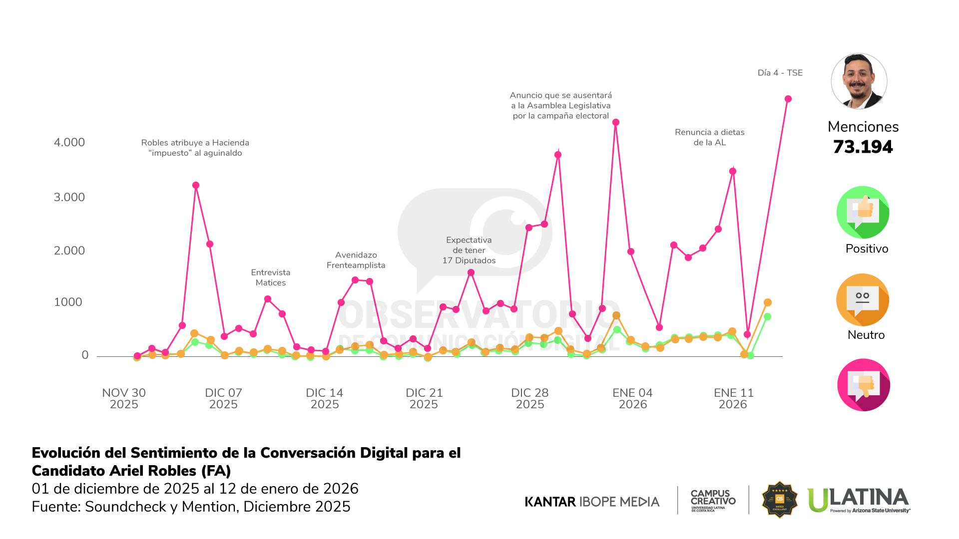 - Anuncios relacionados con la ausencia durante el mes de enero a la Asamblea Legislativa para dedicarse a la campaña electoral generó ruido digital negativo del candidato.