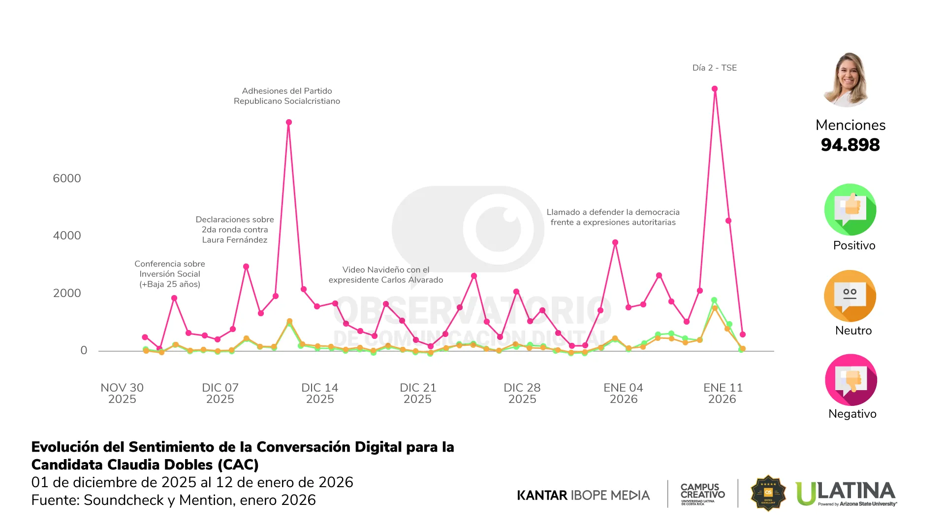 El Observatorio de Comunicación Digital incluyó en este reporte el desempeño de las presentaciones que realizó el Tribunal Supremo de Elecciones (TSE) entre el 9 y el 12 de enero de 2026. Destacando que el Día 3, (Ronny Castillo, Eliécer Feinzaig, Laura Fernández, José Aguilar y Claudio Alpízar) ya que fue el día con mayor cantidad de dispositivos conectados en vivo y por lo tanto, mayor cantidad de conversación digital alrededor de las candidaturas.