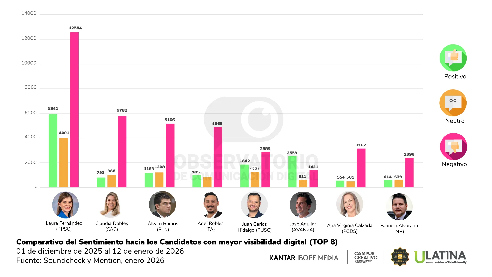En este contexto, figuras de alta visibilidad como Claudia Dobles (CAC) y Ariel Robles (Frente Amplio) exhiben los niveles más elevados de negatividad relativa (78% y 77% respectivamente), lo que sugiere que una parte significativa de su exposición pública está mediada por narrativas de confrontación, crítica o deslegitimación. Laura Fernández (PPSO), pese a ser la candidata con mayor volumen de menciones del período (113.722), mantiene un perfil de negatividad más contenido (69,2%), acompañado de un componente positivo (17,7%) superior al de varias candidaturas con menor visibilidad.