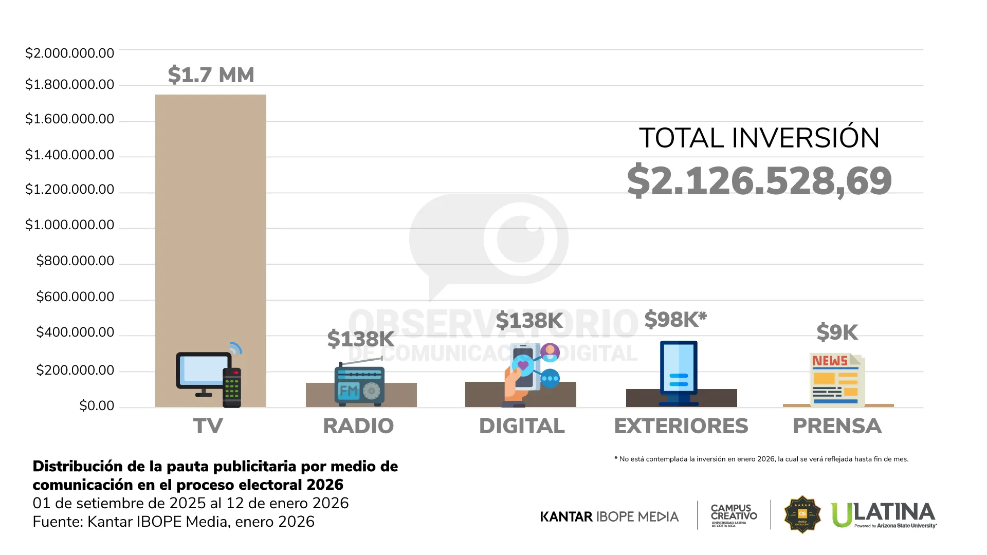 Según datos de la empresa Kantar IBOPE Media se ha invertido $2.126.528,69 en publicidad para los partidos políticos, entre el 1 de setiembre de 2025 y el 12 de enero de 2026.