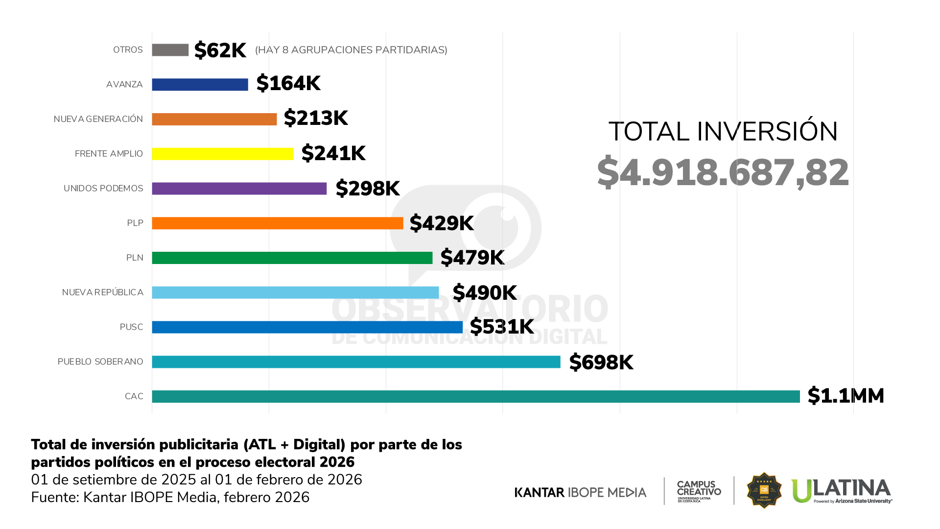 Inversión Publicitaria: Cantidad de dinero que han invertido los partidos políticos en pauta publicitaria. Las cifras están resumidas en miles de dólares. No aplica descuentos que tengan las agencias o partidos políticos previamente negociados con los medios de comunicación.