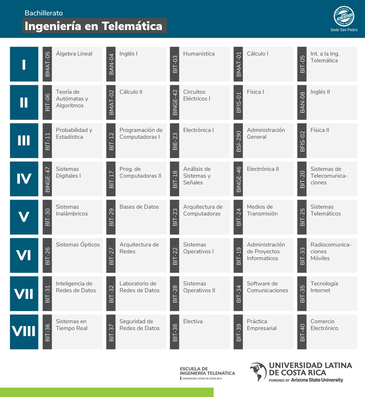 La carrera de Ingeniería en Telemática de la Universidad Latina de Costa Rica combina las telecomunicaciones con la informática de manera que forma profesionales calificados en el diseño y la operación de redes de comunicaciones, con sólidos conocimientos acerca de las plataformas y aplicaciones computacionales que generan la información transportada a través de dichas redes.