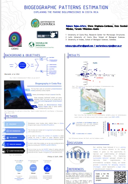 El proyecto Bioluminiscencia, surge en 2020 como un proyecto colaborativo para dar apoyo al proyecto Bioluminiscencia de Costa Rica, el cual fundado por la Cientifica Rebeca Rojas con el objetivo de generar la primera base de datos que registre eventos de bioluminiscencia acuática en Costa Rica a través de su página en Facebook “Bioluminiscencia Costa Rica” con el fin de avanzar en los procesos de investigación sobre la bioluminiscencia a nivel nacional dado que es tema que se encuentra aún en estapas muy tempranas. Como parte del apoyo hemos trabajado de forma conjunta para aportar una evaluación de los patrones bioluminiscentes y biogeográficos a escala local, mediante la correlación de variables ambientales, topográficas y bioquímicas marinas con informes de presencia basados en la ciencia ciudadana.