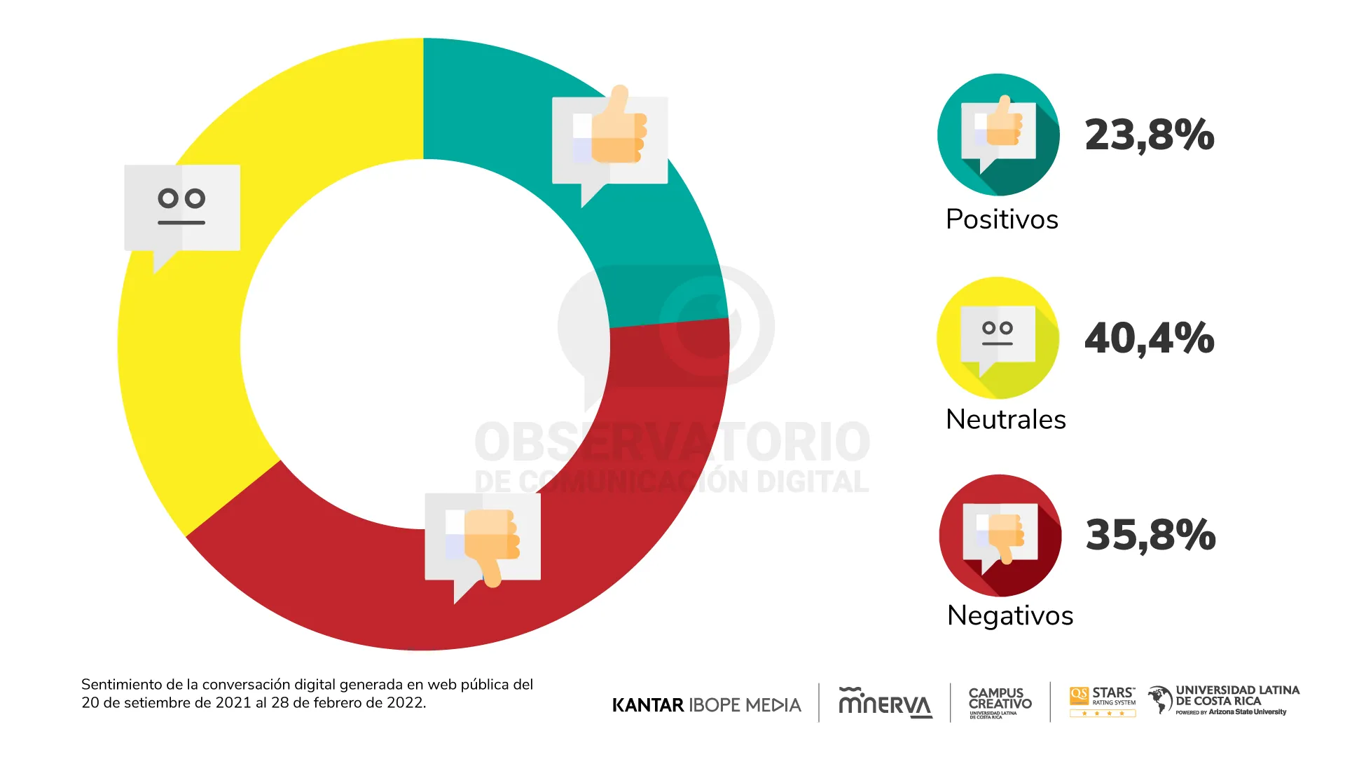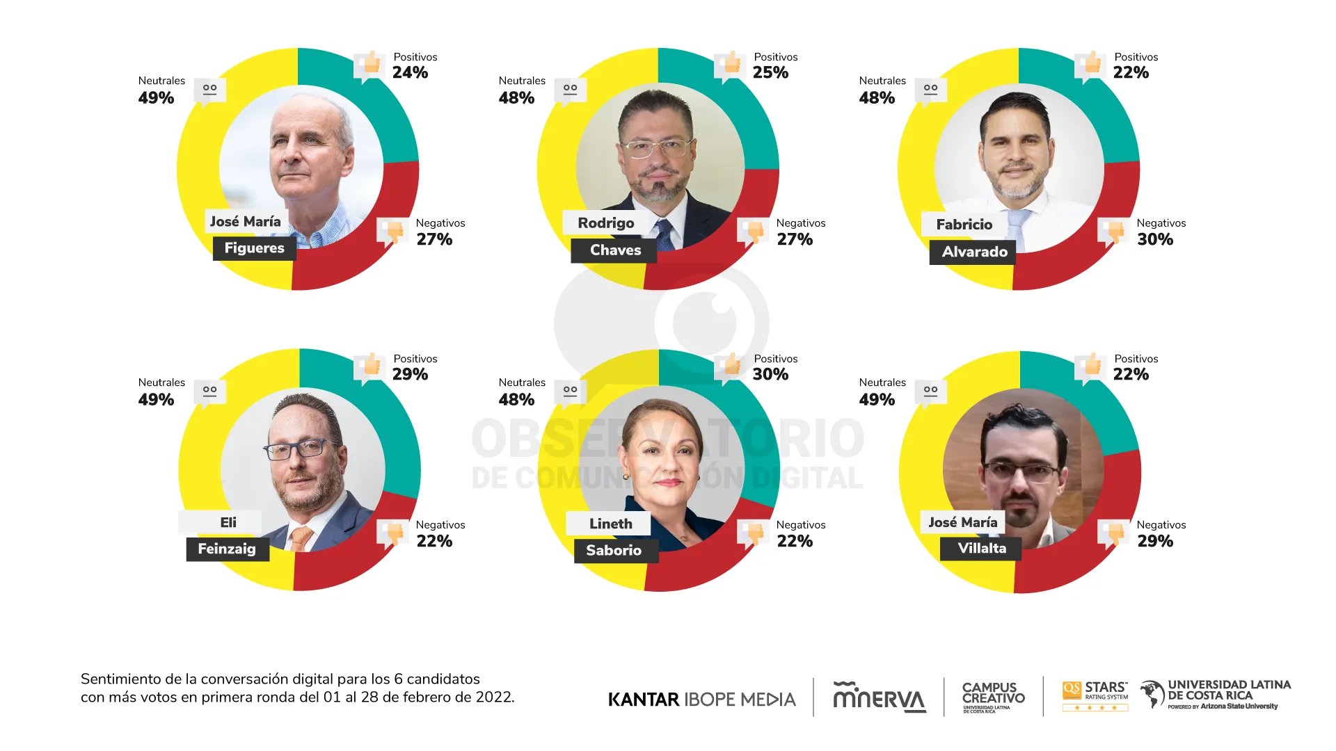 - Que solo 2 de cada 10 comentarios sea positivo en la conversación digital revela la poca afinidad de la población en general hacia la clase política, representantes y la dinámica general de los procesos electorales, lo cual, amerita de parte de la academia, Tribunal Supremo de Elecciones y otras entidades el investigar a profundidad, ya que el porcentaje de abstencionismo en el país llegó a una cifra récord en este periodo electoral.