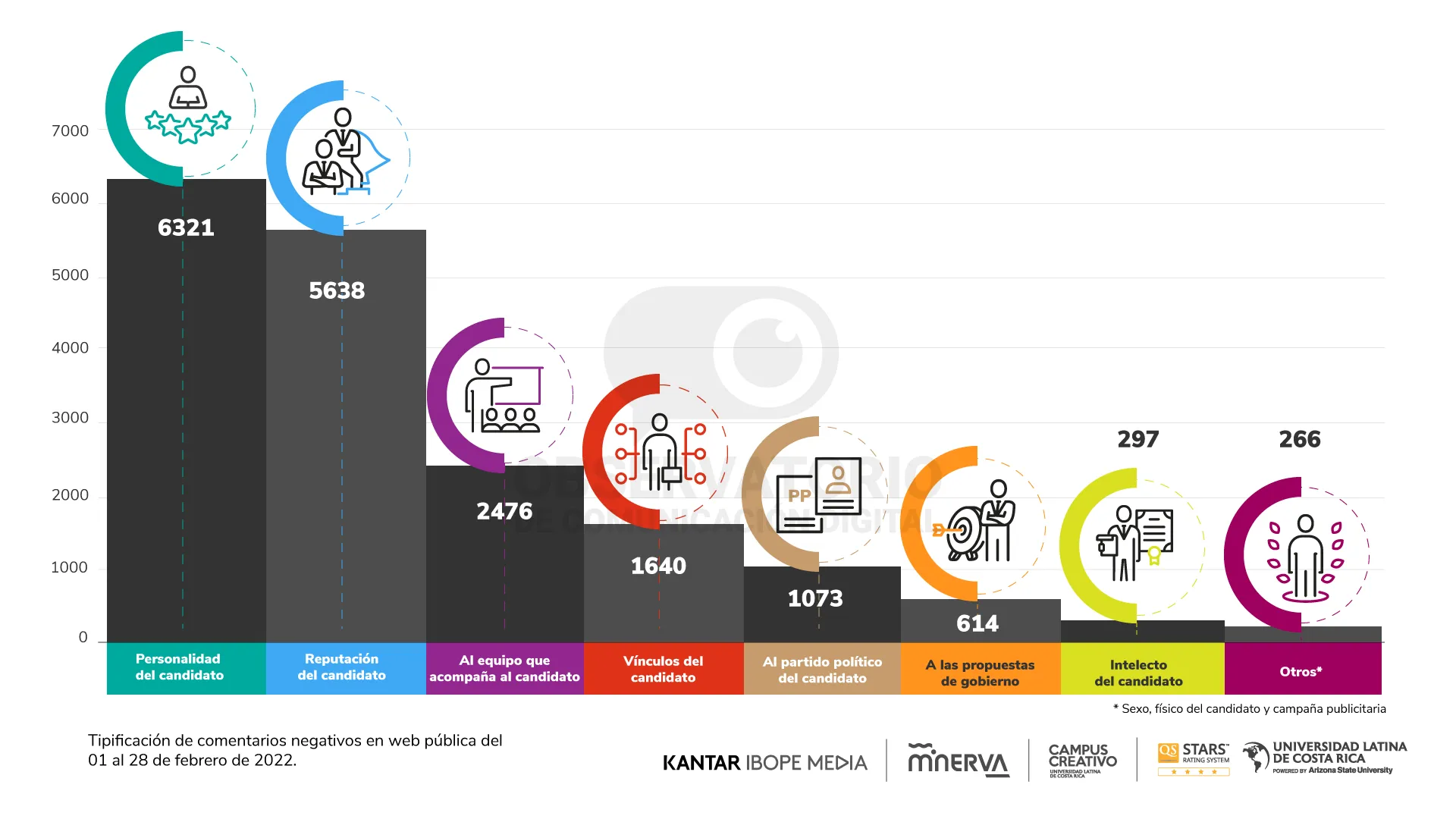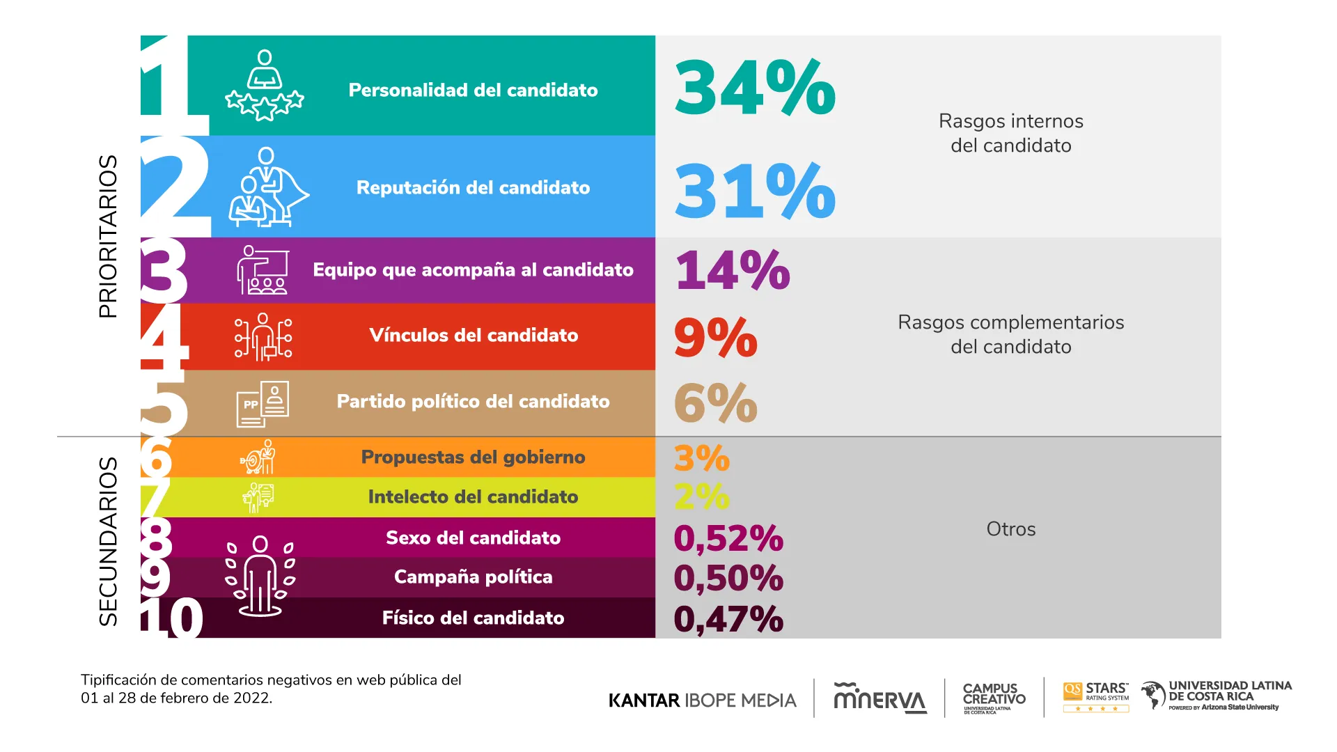Al revisar los elementos prioritarios, de igual forma, se agruparon en dos categorías, siendo los rasgos internos del candidato como su personalidad o reputación, elementos muy importantes; ya que 6 de cada 10 comentarios negativos fueron en esa vía. Febrero se caracterizó principalmente por tener el día de la elección y las reacciones directas de dicho resultado, por lo que muchos de los comentarios negativos en redes sociales, fueron reiterativos hacia le reputación del candidato José María Figueres y la personalidad del candidato Rodrigo Chaves.