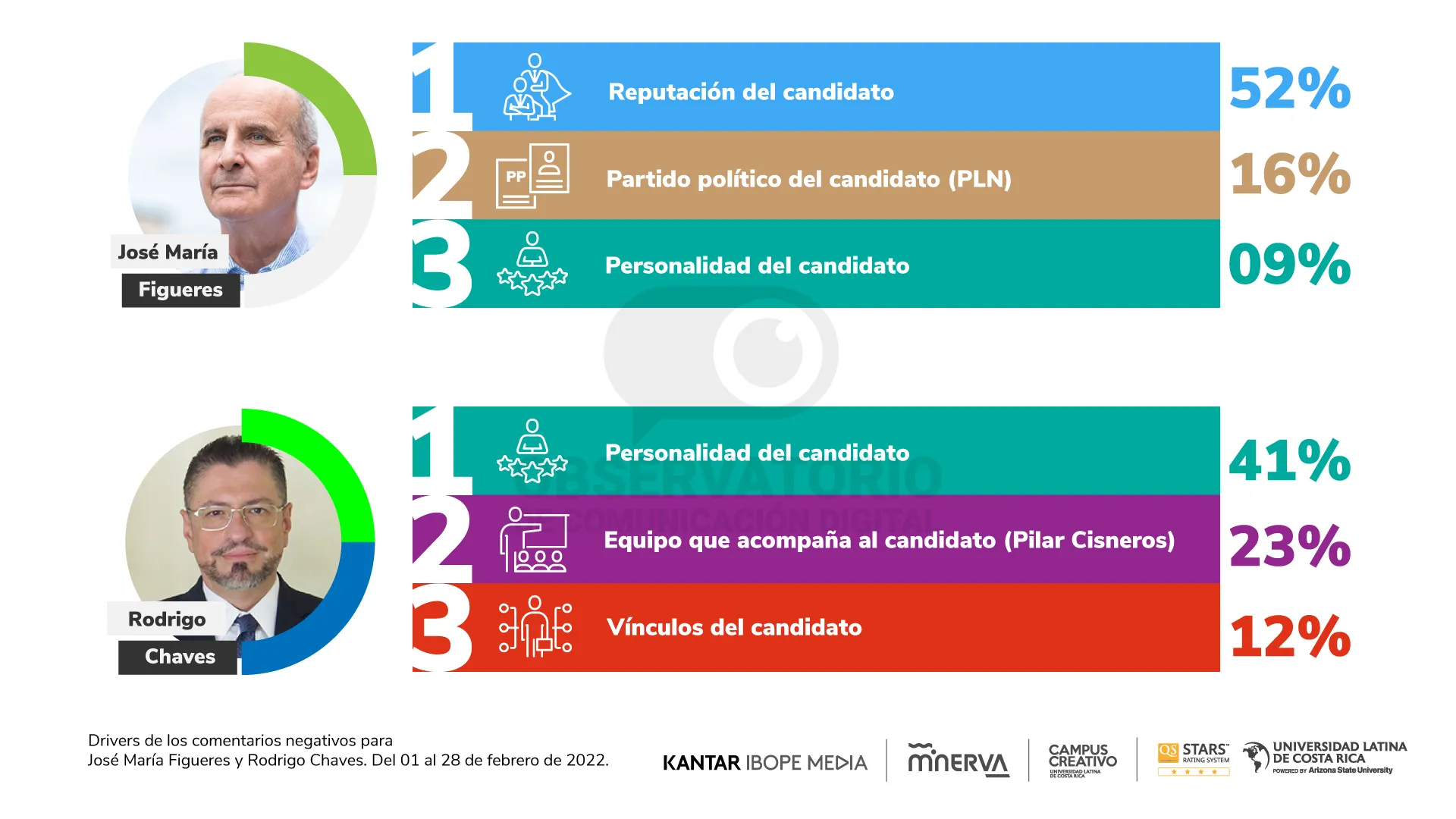 Mientras que Rodrigo Chaves, recibe una gran cantidad de comentarios negativos alrededor de su personalidad, sobre todo en la “forma” en que aborda los temas, sobre todo en sus últimas apariciones en debates donde tuvo algunos calificativos de “arrogancia”, que de igual manera se repite en forma constante por parte de los cibernautas nacionales.