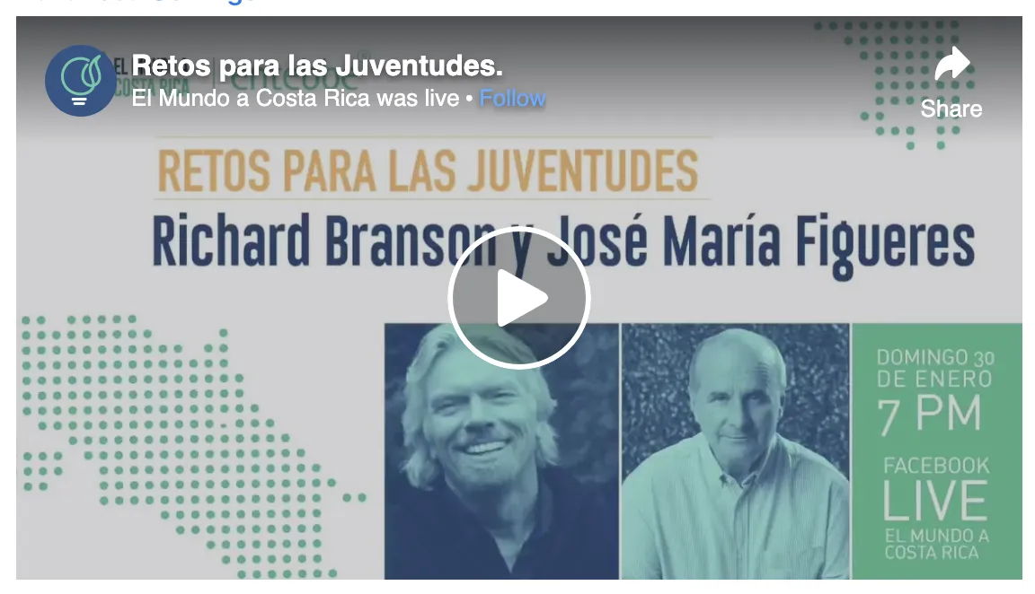 Y en el caso de José María Figueres, se hizo el domingo 30 de enero de 2022 un conversatorio de 30 minutos por redes sociales con el empresario y filántropo Sir Richard Branson; sin embargo, a la hora de la transmisión coincidió con el final del partido de la selección nacional contra México, por lo que tuvo un máximo de dispositivos conectados que rondó los 2K aparatos electrónicos.