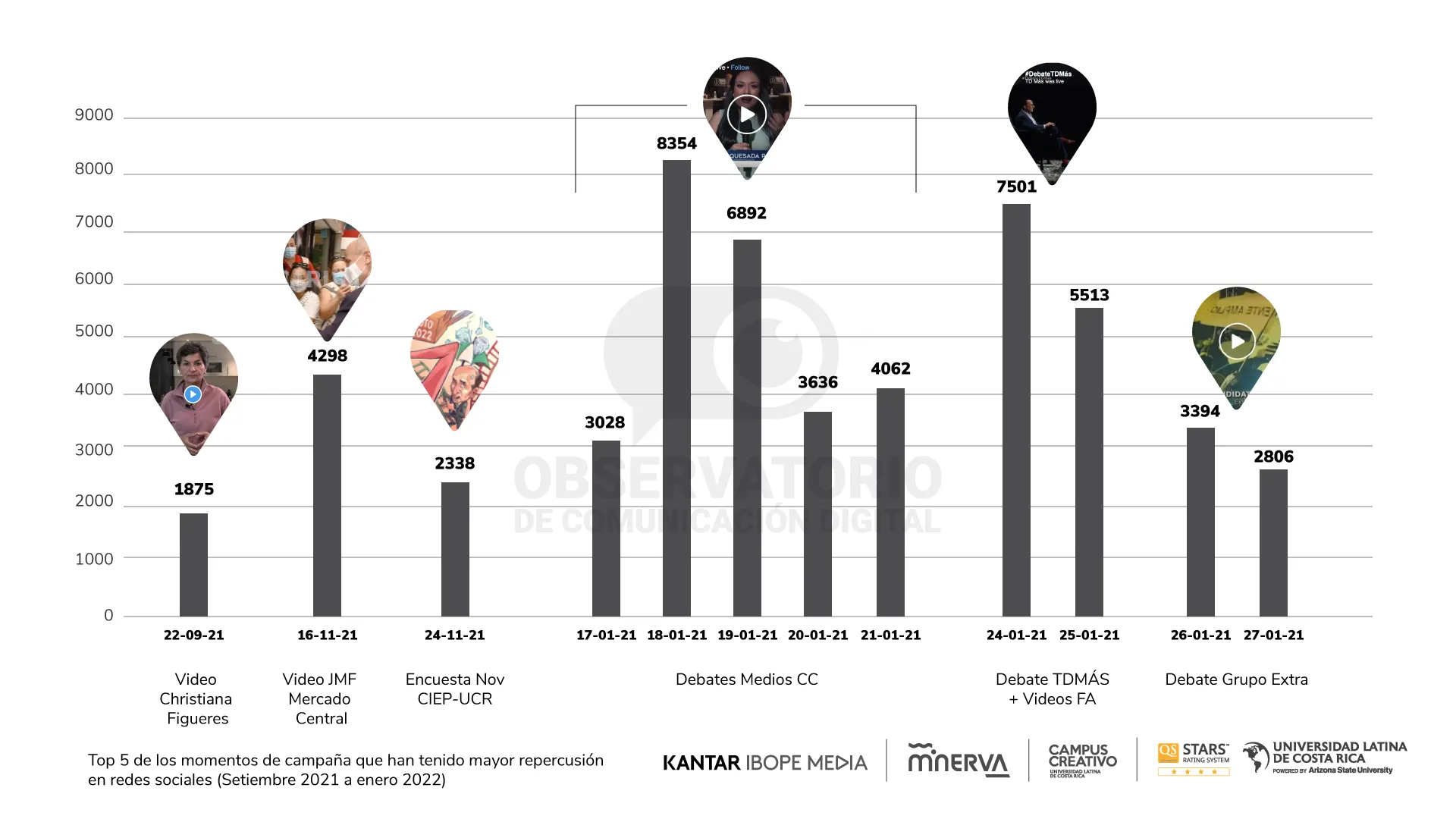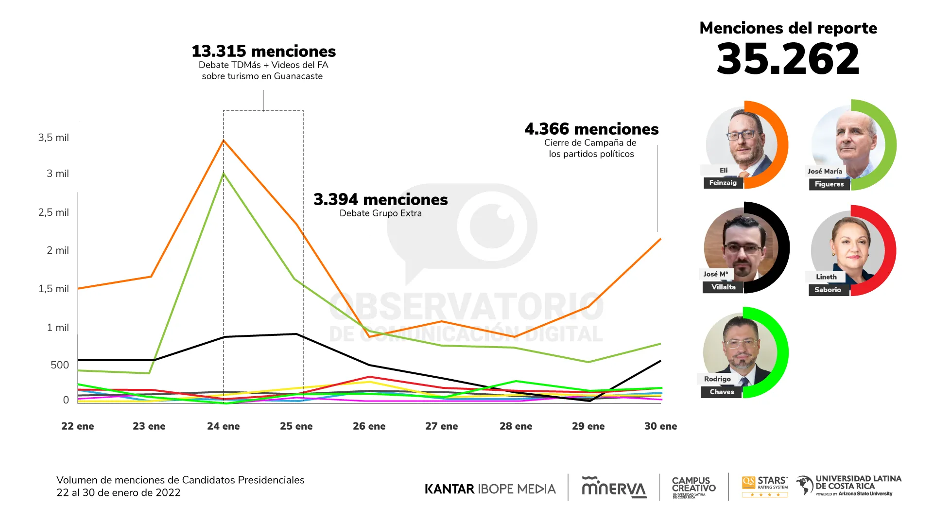 El momento cúspide de las menciones, entre los días 22 al 30 enero de 2022 lo alcanzó el debate organizado por TD Más, entre los candidatos Eli Feinzaig, del Partido Liberal Progresista (PLP) y José María Figueres, del Partido Liberación Nacional (PLN). El formato fue sumamente aplaudido porque ambos candidatos, respetando las reglas de la organización, expusieron sus ideas, reafirmaron sus mensajes clave y resaltaron sus enfoques en caso de asumir la presidencia de la República.