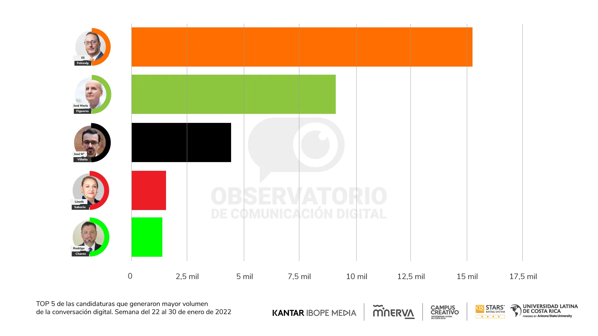 Durante las casi 3 horas de debate, generó un volumen de 6.570 menciones para los candidatos participantes. Siendo Eli Feinzaig quien más menciones recibió con 1.940, en segundo lugar Lineth Saborío con 1.493 y en tercer lugar José María Villalta con 1.235 menciones.