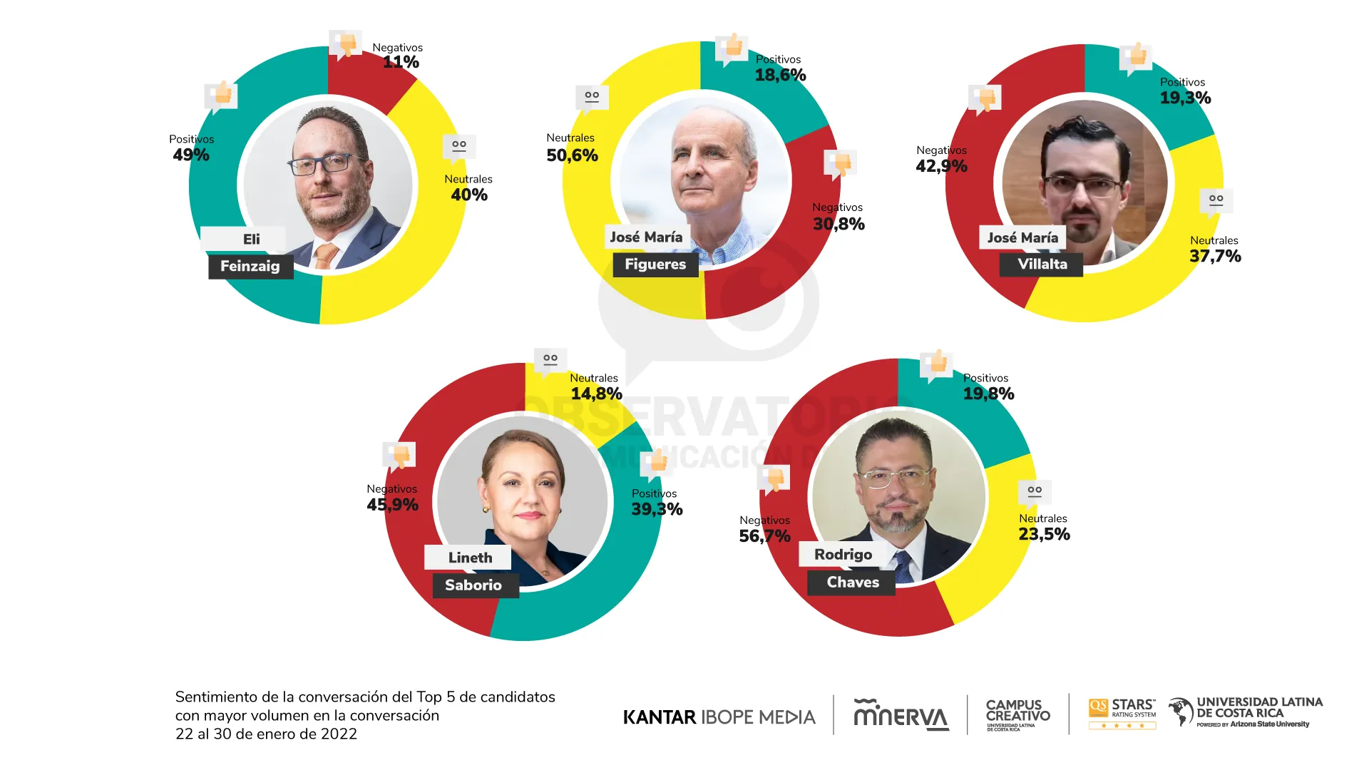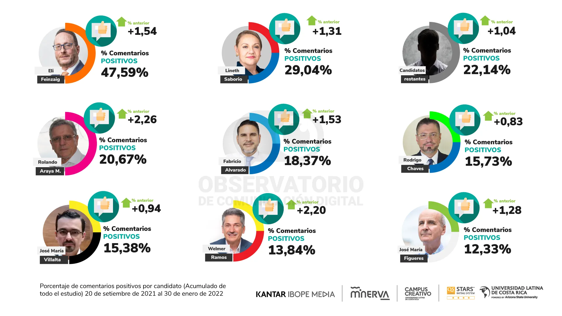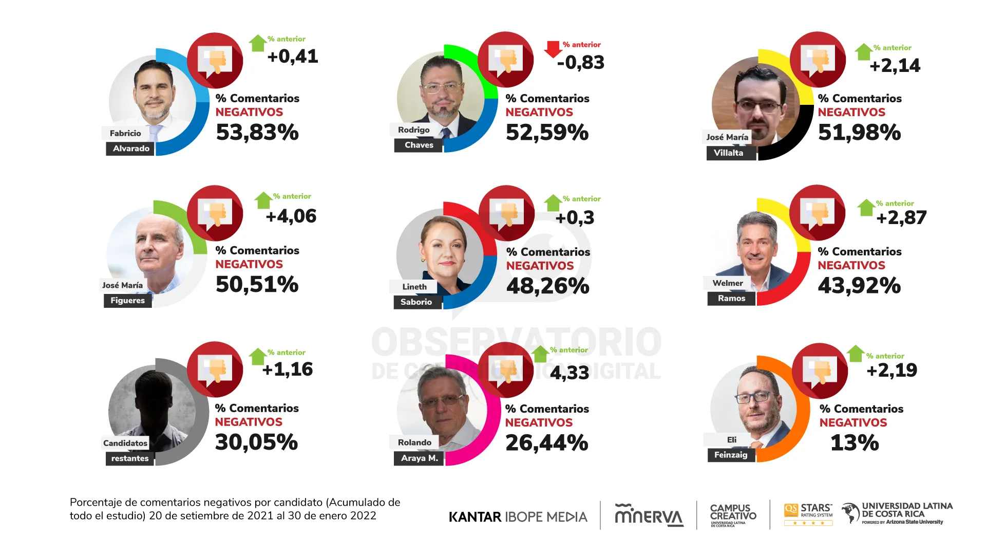 El segundo lugar en opiniones negativas está Rodrigo Chaves con un 52,59% y en tercer lugar José María Villalta con 51,98%. Cabe destacar que Rolando Araya y José María Figueres recuperaron la mayor cantidad de comentarios negativos, este último con un 4,06% de mejora, con respecto al ranking anterior.