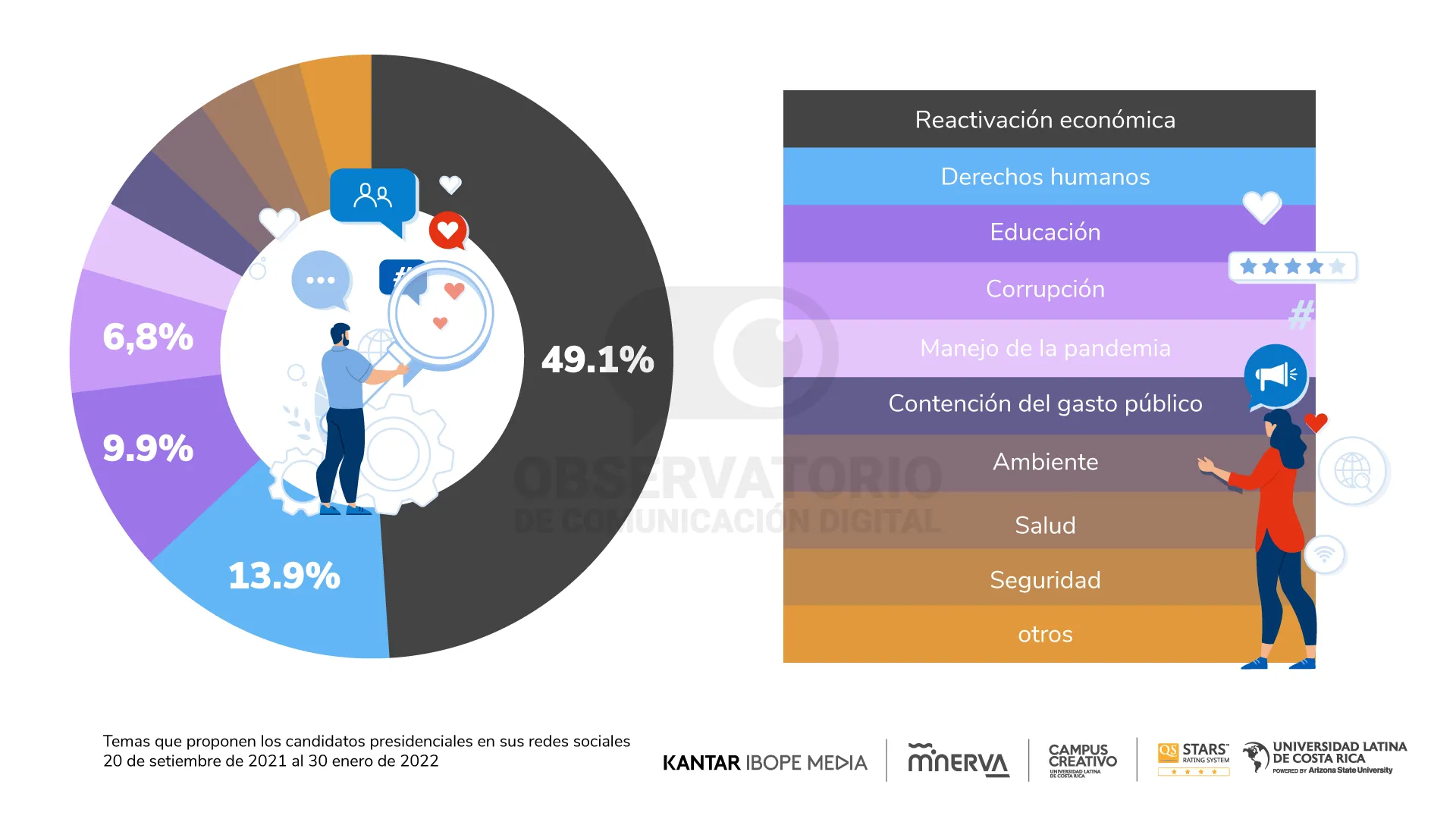 - CORRUPCIÓN: Este tema ocupa el 6,8% de los posteos en redes sociales. Sobre este tema, los candidatos proponen ideas para realizar reformas legales, impulsar nuevas leyes, entre otras. El candidato Rodrigo Chaves es quien se ha posicionado en sus redes sociales con 35 contenidos al respecto. 4.