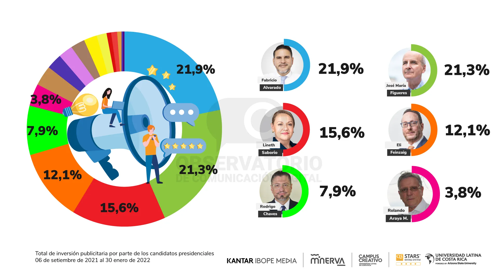 En tercer lugar continúa Lineth Saborío, con $487.971,9, que representa un 15,6% en publicidad. Continúa en el cuarto lugar, el candidato Eli Feinzaig $376.458,59 con un 12,1% de la inversión. Cierra en el top 5 de inversión, Rodrigo Chaves con $247.607,57, con un 7,9% de todo lo gastado por los partidos políticos.