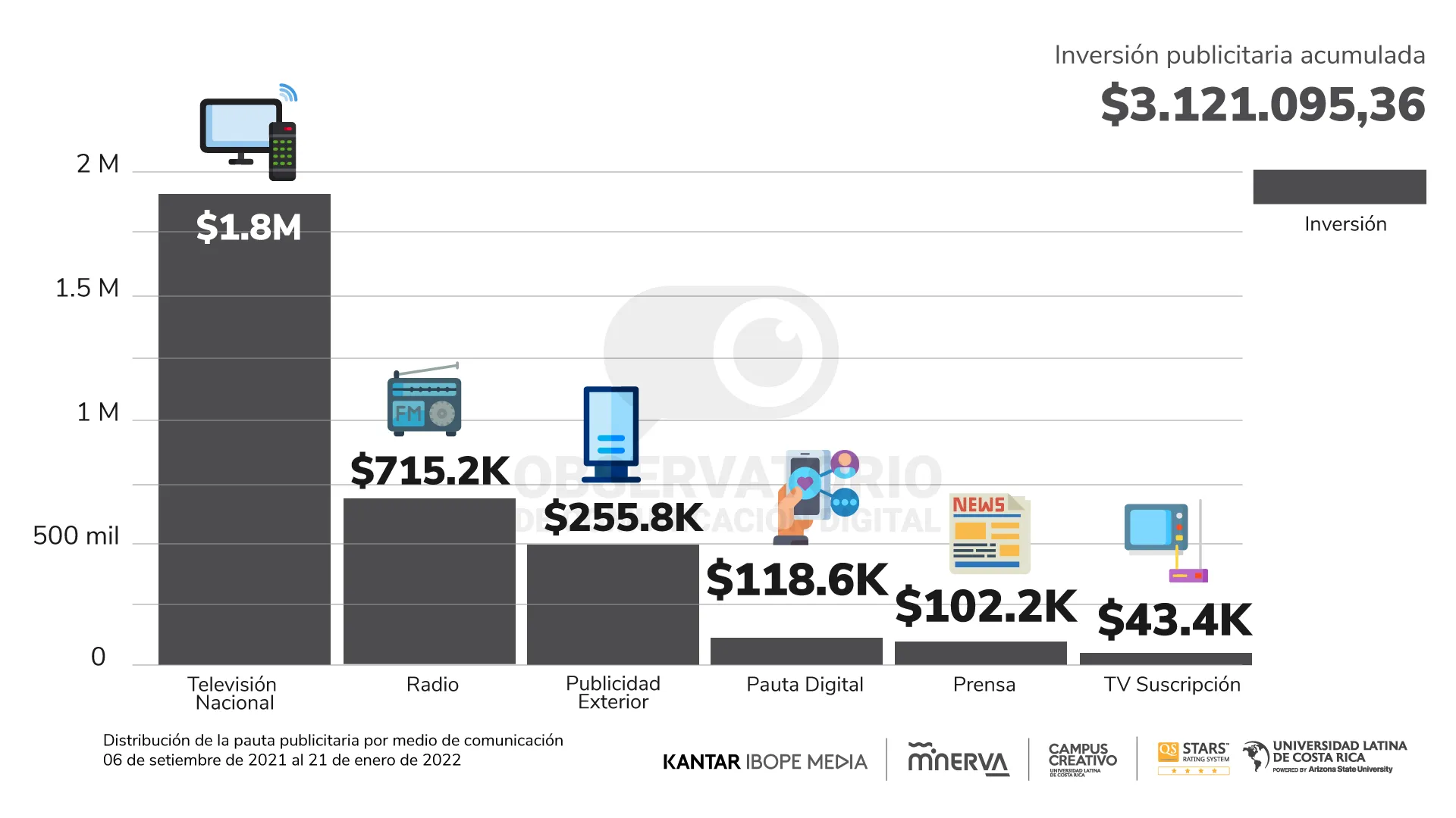 Inversión Publicitaria: Cantidad de dinero que han invertido los partidos políticos en pauta publicitaria. Las cifras están resumidas en miles de dólares. No aplica descuentos que tengan las agencias o partidos políticos previamente negociados con los medios de comunicación.