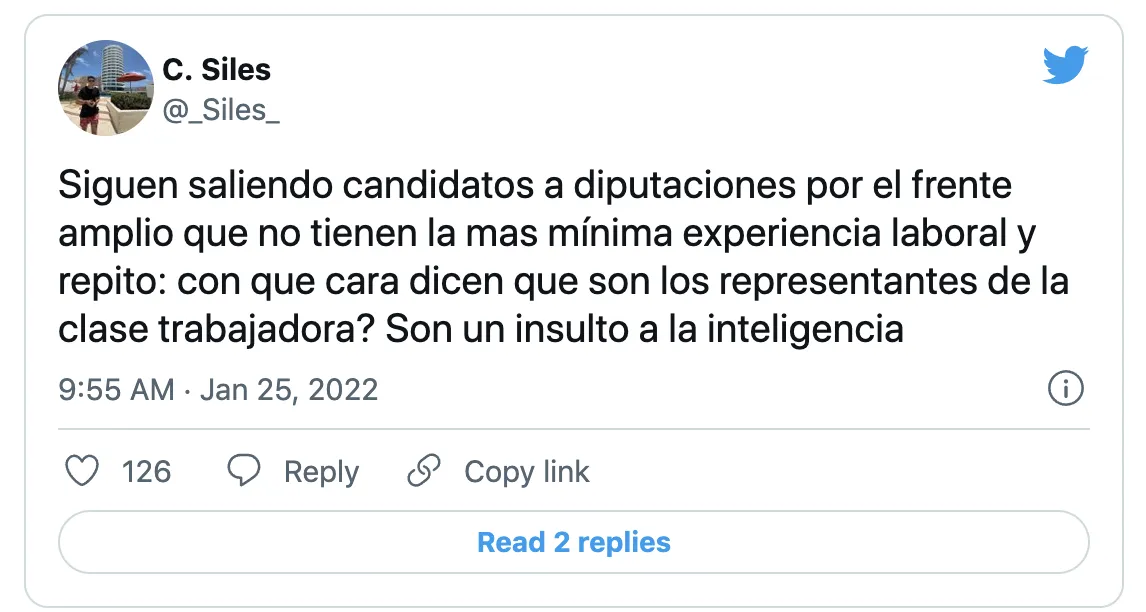 El mismo 24 de enero de 2022, también fueron tendencia, las reacciones a las declaraciones hechas públicas por la candidata a la vicepresidencia del Frente Amplio, Patricia Mora, quién dijo en una gira a Guanacaste: “Vengo a decirles a los señores millonarios que no sean tan desvergonzados, que dejen de estar construyendo hoteles de 7 estrellas en una provincia que conoce del hambre”.