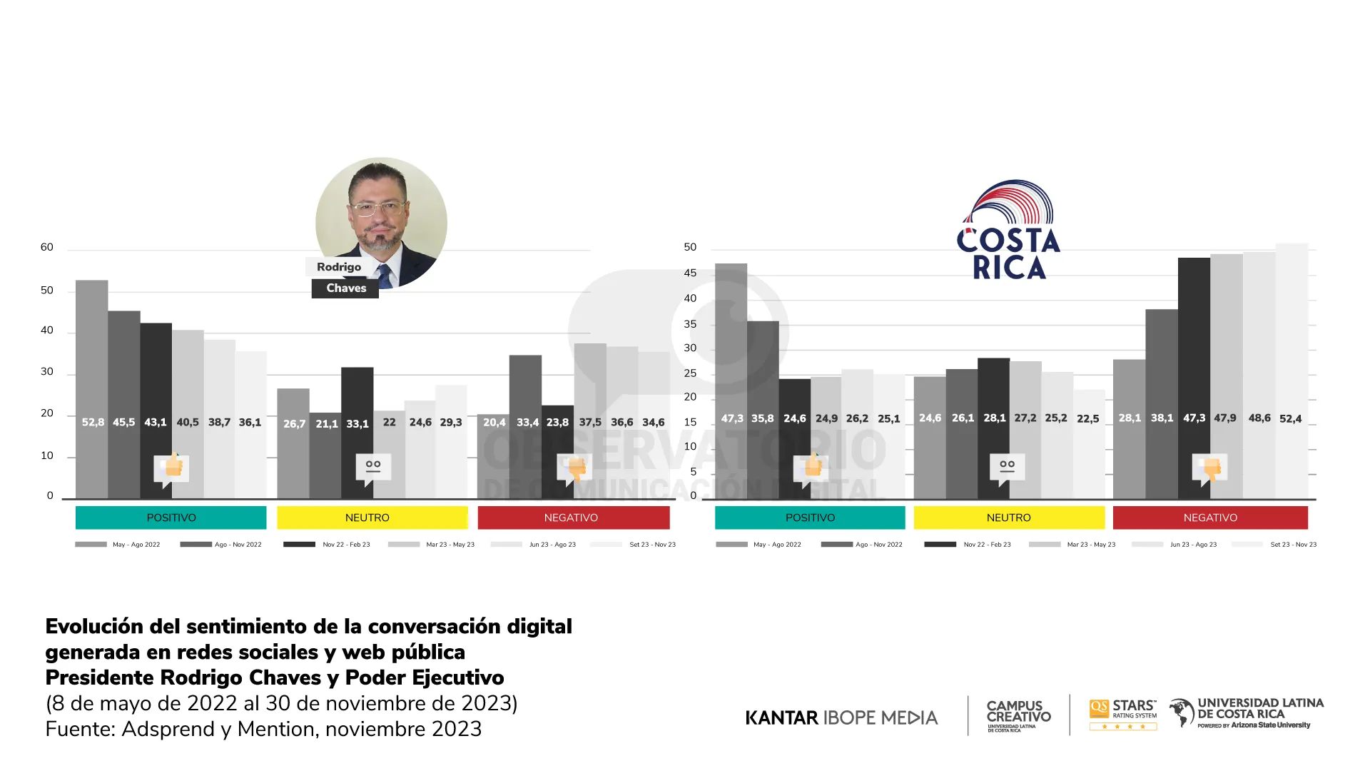 A partir del volumen de la conversación digital para el Poder Ejecutivo, se estudió la valoración de los comentarios, lo cual revela que el 36,1% de todo lo conversado en redes y web pública es positivo para el presidente Rodrigo Chaves Robles, versus el 34,6% de comentarios negativos. Estos datos contrastan con el 25,1% de comentarios positivos y el 52,4% de comentarios negativos que posee el resto de la administración Chaves Robles, donde se encuentran ministros, viceministros y otras figuras de la actual administración.