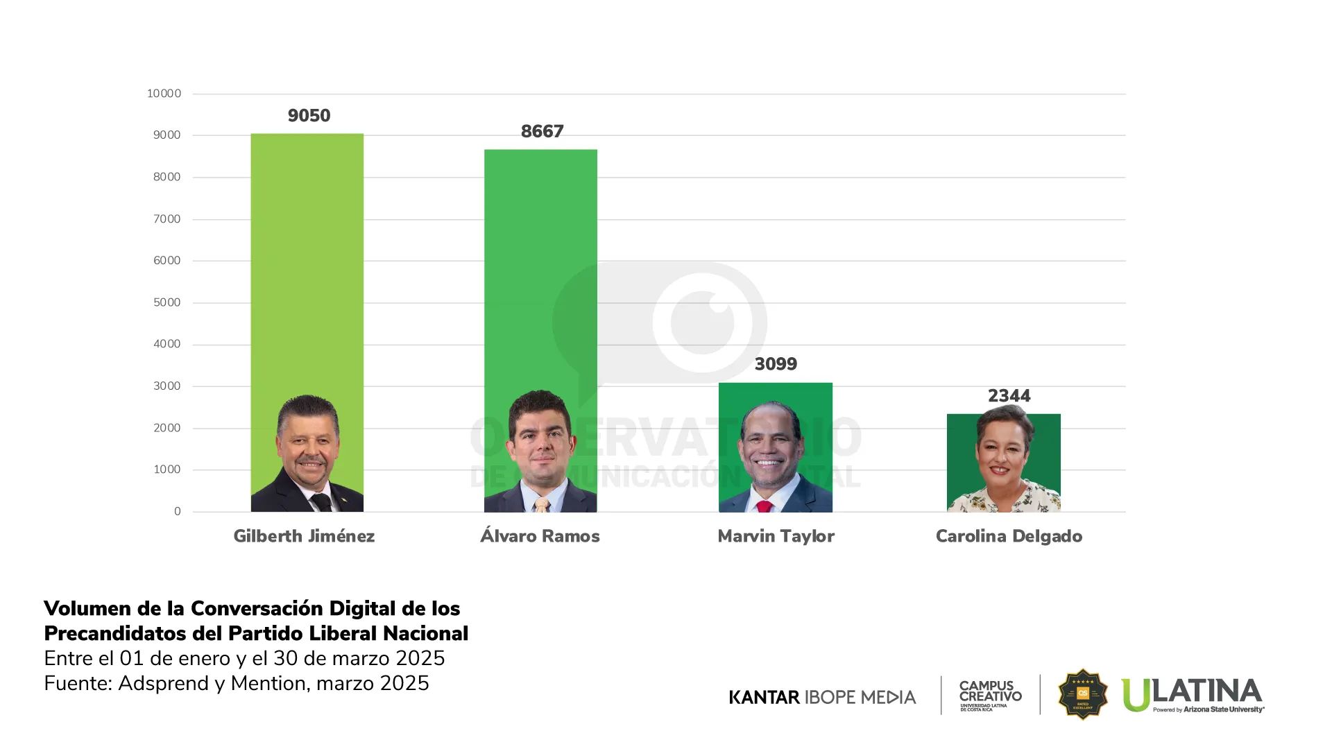 Al analizar el volumen de la conversación digital que generó la convención del Partido Liberación Nacional se nota un proceso electoral sin eco digital. Esto, a la luz de comparar las 23.160 menciones que generaron las 4 precandidaturas entre los meses de enero a marzo 2025, versus las 159.381 menciones que generó durante el mismo periodo otros actores políticos, como el presidente, ministros, diputados, entre otros. (Un 85,5% menos de interés por la convención liberacionista)