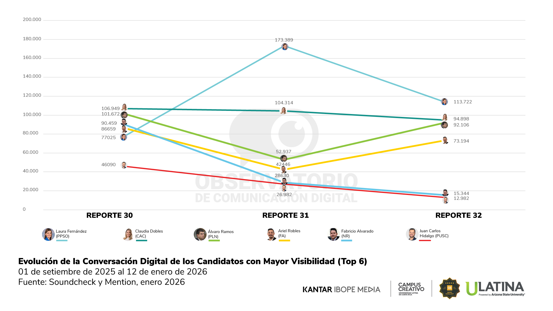 Álvaro Ramos (PLN) y Ariel Robles (FA), por su parte, registran una caída significativa en el Reporte 31, asociada al desplazamiento de la agenda. No obstante ambos recuperan visibilidad en el Reporte 32, lo que indica una base narrativa que se reactiva cuando la conversación digital se fragmenta nuevamente.