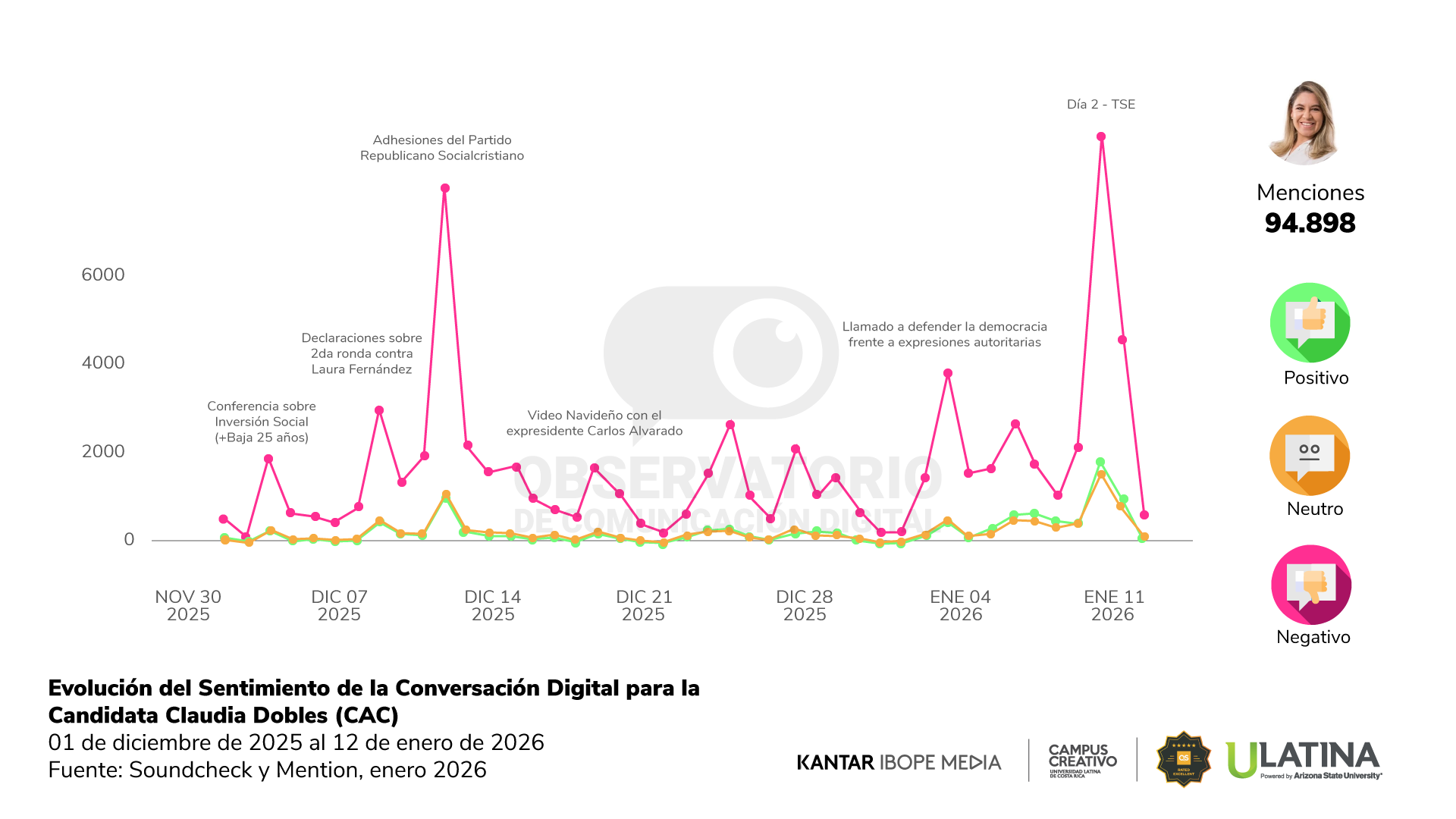 El Observatorio de Comunicación Digital incluyó en este reporte el desempeño de las presentaciones que realizó el Tribunal Supremo de Elecciones (TSE) entre el 9 y el 12 de enero de 2026. Destacando que el Día 3, (Ronny Castillo, Eliécer Feinzaig, Laura Fernández, José Aguilar y Claudio Alpízar) ya que fue el día con mayor cantidad de dispositivos conectados en vivo y por lo tanto, mayor cantidad de conversación digital alrededor de las candidaturas.