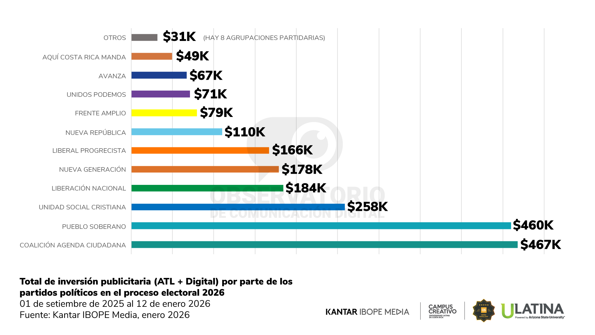 Según datos de la empresa Kantar IBOPE Media se ha invertido $2.126.528,69 en publicidad para los partidos políticos, entre el 1 de setiembre de 2025 y el 12 de enero de 2026.